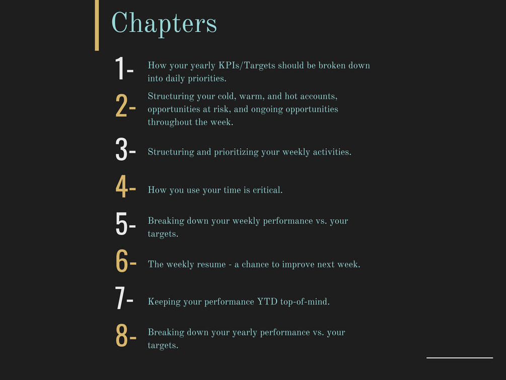 6) Weekly summary and planning: Reflect on market trends, difficult objections, and more from the past week and prepare for the next, continuously refining your approach.
