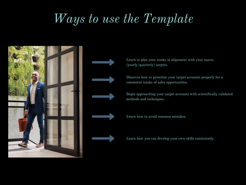 This template serves as your comprehensive guide to structuring your Business Development efforts. It helps you break down your yearly goals into manageable daily tasks, organize your accounts by priority, perform your daily and weekly tasks, and ensure that every week is aligned with your long-term targets. You'll also find inspiration to analyze your performance regularly, allowing you to make adjustments that keep you on track. With this template, you’ll have a clear path to success and the confidence to follow it.